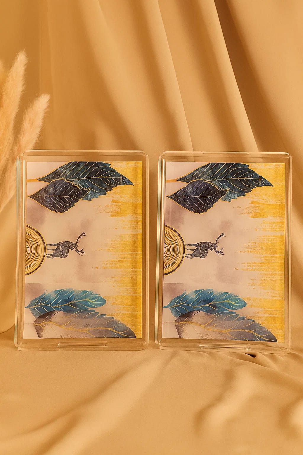 Add a touch of artistic elegance to your home with our Abstract Blue Leaf Acrylic Tray, where modern design meets natural inspiration. Featuring deep blue and teal leaves with golden highlights, complemented by abstract textures in yellow and beige, this tray brings a contemporary yet organic charm to any setting.
