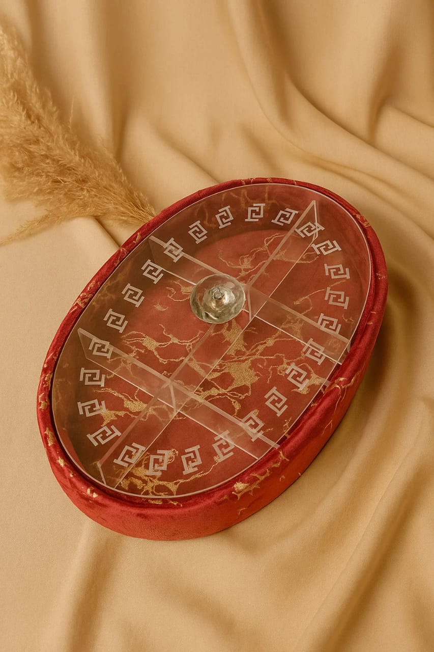 The transparent glass lid, detailed with a geometric border and a crystal-style knob, makes it easy to see the treats inside while keeping them covered and protected. The inner compartments allow you to serve a variety of dry fruits, nuts, or sweets in an organized and elegant way.